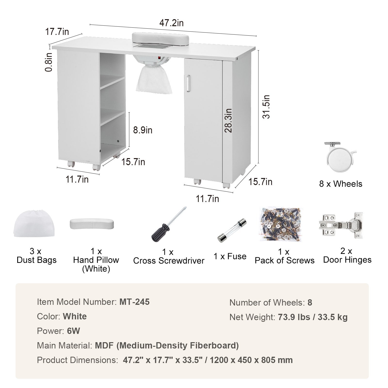Manicure Table, Nail Table Station With Electric Dust Collector, Moveable Nail Tech Desk With 8 Wheels 4 Lockable, 3 Dust Bag & Wrist Rest, MDF Nail Art Workstation For Spa Beauty Salon, White